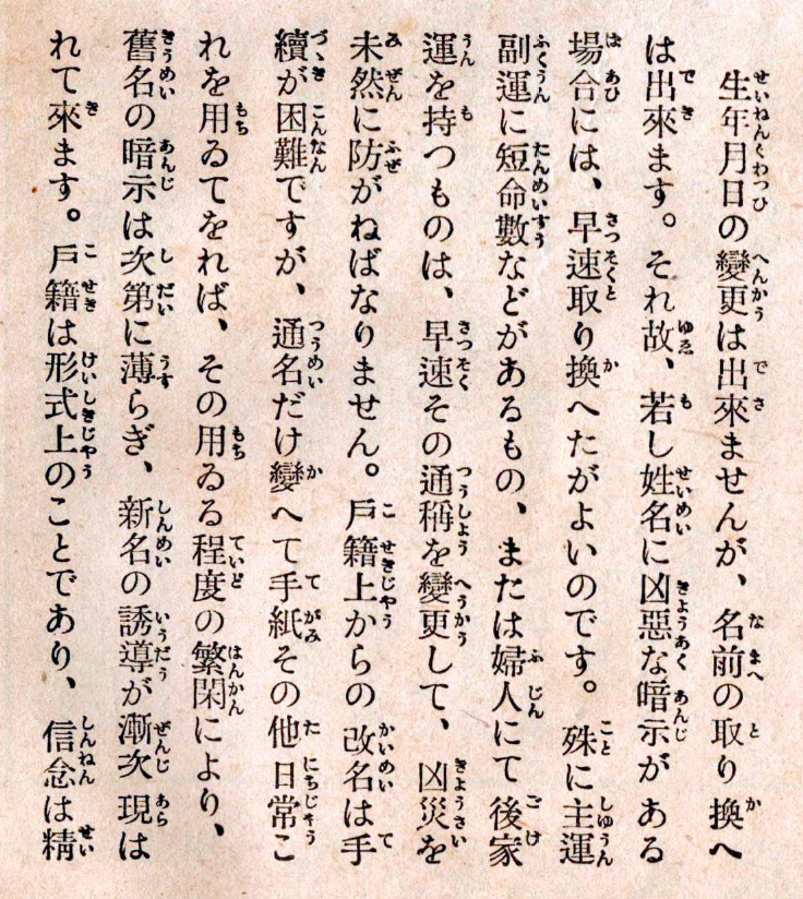 ![]() お名前に関するご相談(改名・通称名・芸名・筆名に限りご相談を受け賜ります。)1. お名前を変えるにあたってまず、始めに考えて頂きたい事は、改名せずとも私の助言に従って注意して人生を歩んで頂ければ人生は良い方向に向かって開けて行くということです。それでもどうしても改名したい人には、3つのアドバイスを差し上げます。 a). 改名や改姓は、一般に皆様が考えて居られるほど簡単なものではありません。山本式姓名判断では、戸籍に記載されている姓名を元に運勢を判断しますが、この「戸籍名」が戸籍法によって厳密に管理されている為、あなたの場合、改名や改姓が戸籍法で許されるかどうかが、重要なポイントになってきます。 一般に改名が可能か否かは、役場の戸籍係の人や弁護士の先生に御相談頂くのがベストです。おおよそ、次のような場合には改名や改姓が可能と思われますので、御参考にして下さい。 改名の場合
